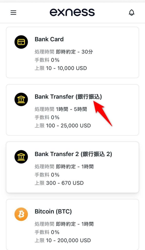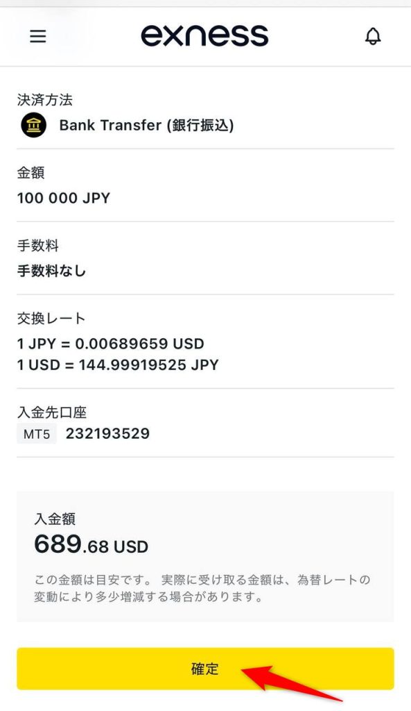 【エクスネス 入金方法 銀行振込】 FX X Facebook はてブ Pocket LINE コピー 2025.04.092026.01.23 ① ログイントップページの入金したい口座の「入金」を選択 ② 入金手段「Bank Transfer(銀行振込)」を選択 ③ 「金額」部分に入金額を入力し、「続ける」を選択 ④ 入金額を確認し、「確定」を選択 ⑤ 利用規約を確認し、「利用規約を読み、同意します。」を選択 ⑥ 表示された振込先に振込して終了(ネットバンキング可) ※ 例のとおり、「振込名義」の冒頭に「振込ID」を入力すること
