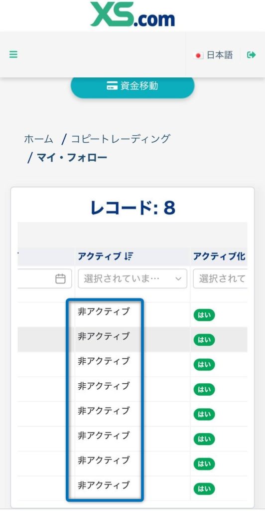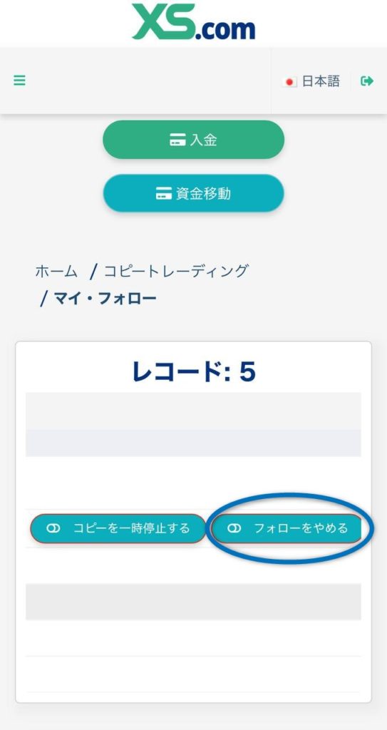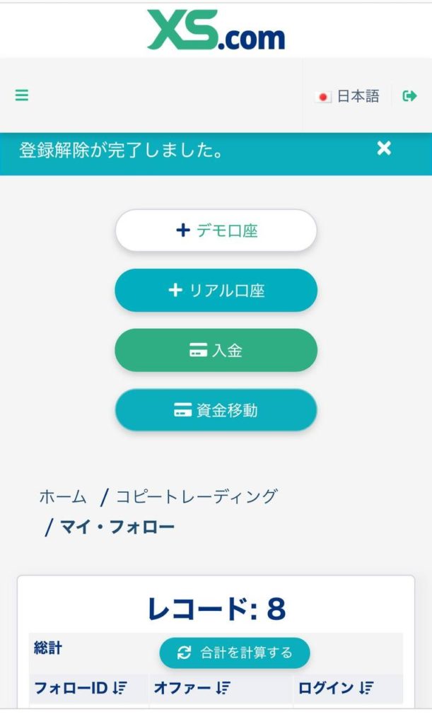 【XS コピトレ フォロー解除】 FX X Facebook はてブ Pocket LINE コピー 2025.07.182026.01.23 ① 「マイ・フォロー」を選択 ② 「フォローをやめる」を選択 フォローしているアカウントを一番右までスクロール ③ クローズタイプを「すべてのポジションを・・・やめる」に選択 ※保有中のポジションがあった場合は、強制決済されるので注意 ④ 「登録解除が完了しました。」が表示されればOK ⑤ アクティブが「非アクティブ」になっていればOK ロックが解除され、自由に出金(資金移動)ができるようになります。 ◆ 資金移動のやり方は、こちらから ◆ コピトレを再開するための再フォロー方法は、こちらから